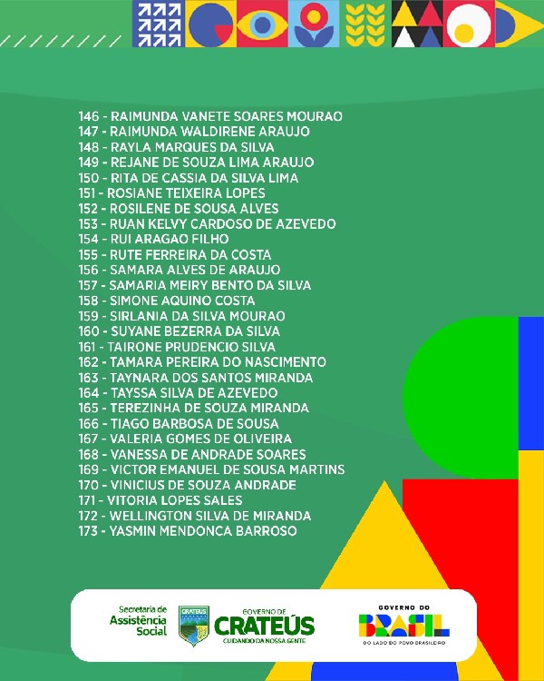 O Governo de Crateús, por meio da Secretaria de Assistência Social, informa que mais de 173 famílias do município estão sendo beneficiadas pelo programa Programa Bolsa Família.