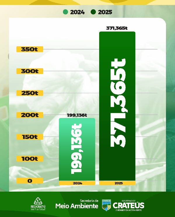O Governo de Crateús, por meio da Secretaria do Meio Ambiente, apresenta a evolução do total mensal de material reciclável coletado pela Associação Recicratiú, evidenciando o crescimento expressivo entre os anos de 2024 e 2025
