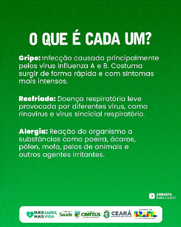 O Governo de Crateús, por meio da Secretaria Municipal de Saúde, orienta a população sobre as diferenças entre gripe, resfriado e alergia, reforçando a importância de identificar corretamente os sintomas para garantir o cuidado adequado.