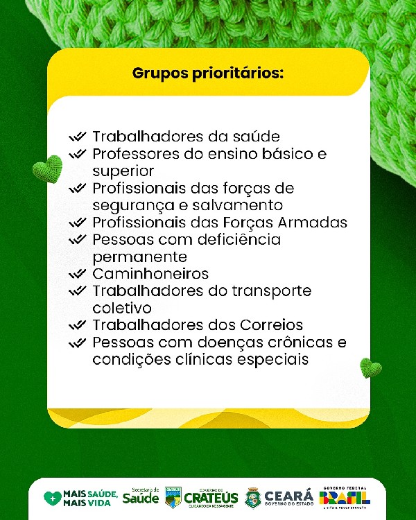 O Governo de Crateús, por meio da Secretaria de Saúde, informa que a Campanha de Vacinação contra a Influenza começa no dia 24 de março, com doses disponíveis em todas as Unidades Básicas de Saúde do município.