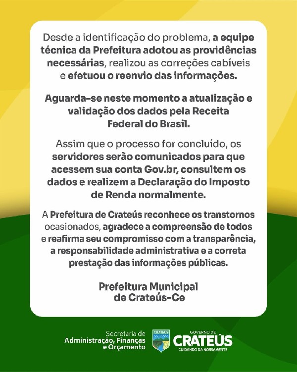O Governo de Crateús, por meio da Secretaria de Administração, Finanças e Orçamento, informa que foram identificadas inconsistências em algumas informações enviadas ao eSocial, referentes ao exercício de 2025, o que pode impactar a Declaração do Imposto de Renda de servidores municipais.