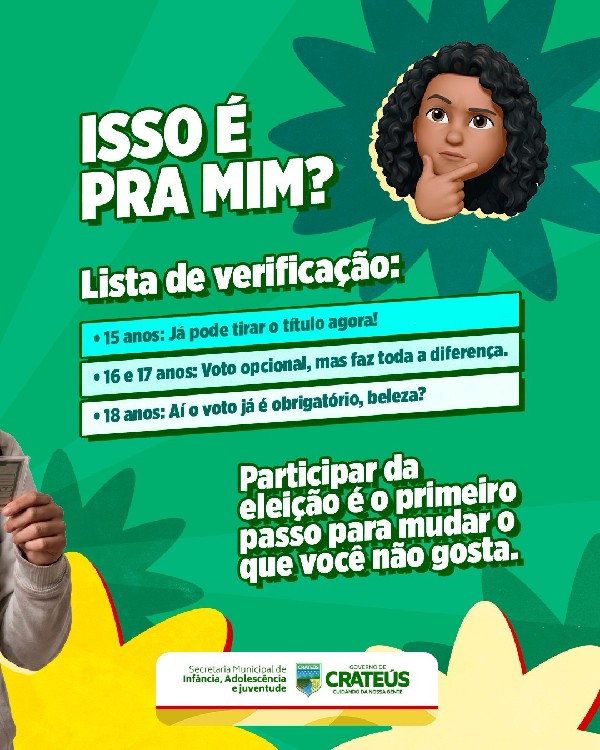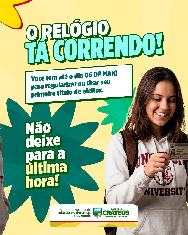 O Governo de Crateús, por meio da Secretaria de Infância, Adolescência e Juventude, faz um chamado importante para a juventude crateuense: o prazo para tirar ou regularizar o título de eleitor está acabando!