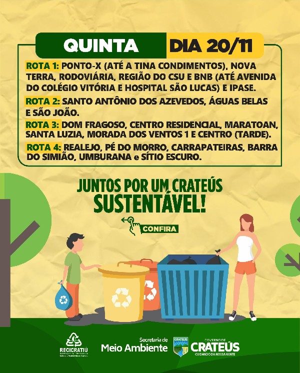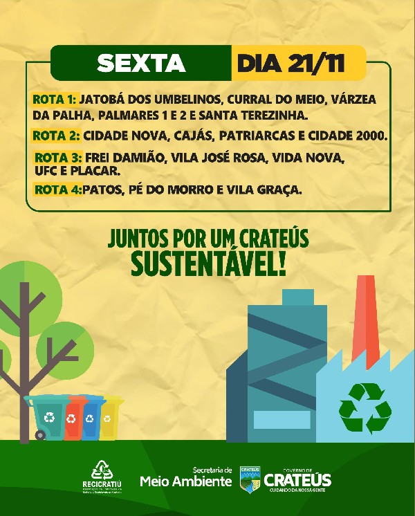 O Governo de Crateús, por meio da Secretaria de Meio Ambiente e da Recicratiú, divulga o calendário das rotas da coleta seletiva referente aos dias 17 a 21 de novembro.