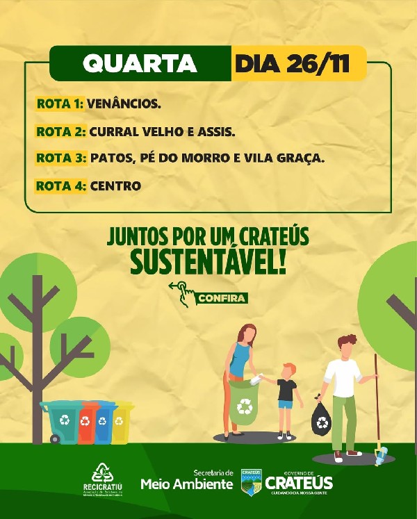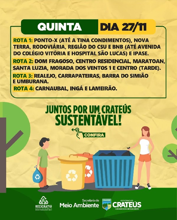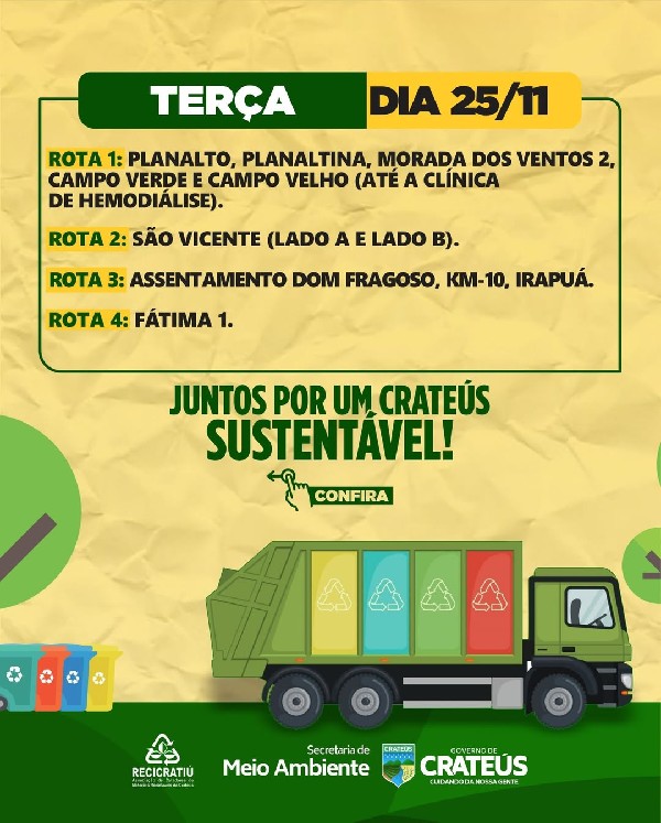 O Governo de Crateús, por meio da Secretaria de Meio Ambiente e da Recicratiú, divulga o calendário das rotas da coleta seletiva referente aos dias 24 a 28 de novembro. A ação reforça o compromisso com a gestão responsável dos resíduos e incentiva a participação da população na separação e destinação correta do lixo reciclável, contribuindo para uma cidade mais limpa e sustentável.