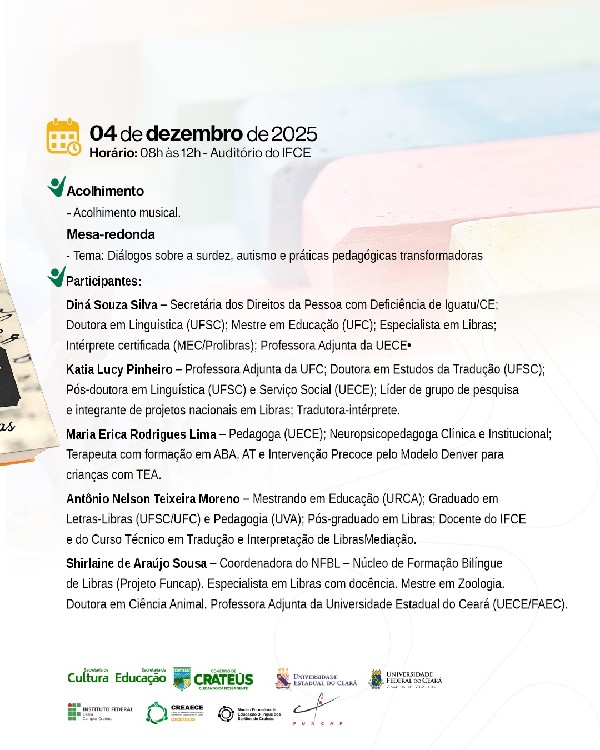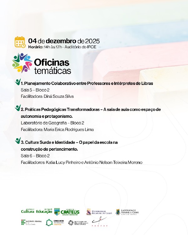 Palestras inspiradoras, oficinas temáticas, mesa-redonda, apresentações culturais e momentos de troca que fortalecem o compromisso com uma educação verdadeiramente inclusiva.