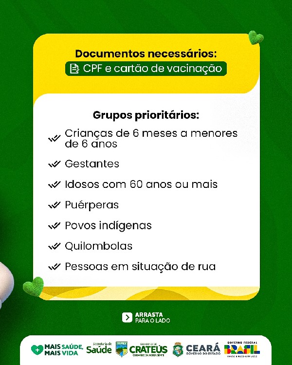 O Governo de Crateús, por meio da Secretaria de Saúde, informa que a Campanha de Vacinação contra a Influenza começa no dia 24 de março, com doses disponíveis em todas as Unidades Básicas de Saúde do município.