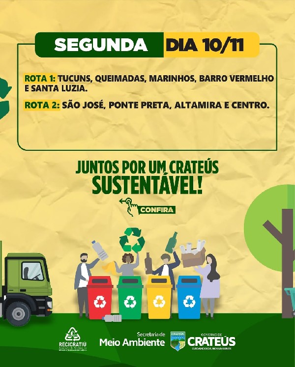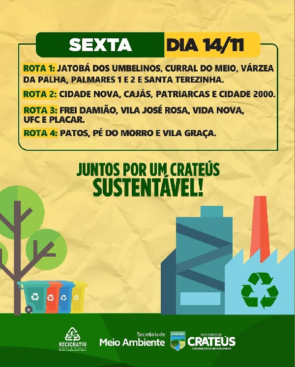 O Governo de Crateús, por meio da Secretaria de Meio Ambiente e da Recicratiú, divulga o calendário das rotas da coleta seletiva referente aos dias 10 a 14 de novembro.