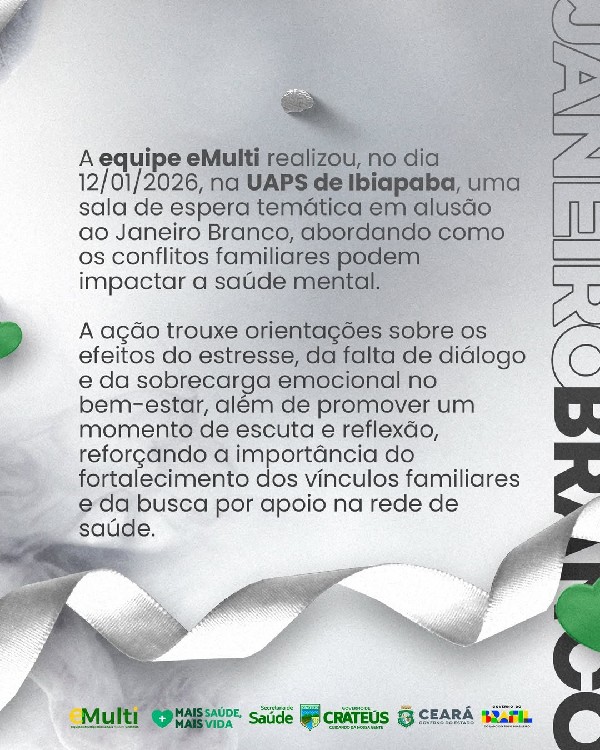 No dia 12/01/2026, a equipe eMulti promoveu, na UAPS de Ibiapaba, uma sala de espera temática abordando como os conflitos familiares, o estresse e as dificuldades de diálogo podem afetar a saúde mental.